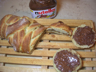 I made up another batch of Pecan Tassies yesterday. . . mostly due to a certain 4 year old who feels that tons of cookies in the house means you can eat them whenever your mother is not looking. . . but I digress. This time I put less filling in them, and they were so much easier to get out of the pan, so that's good. I had about 1/3 of a cup of leftover filling, and I am far too thrifty to throw that away. I also had about a canteloupe sized ball of brioche dough in my fridge that needed to be used, so I rolled a little of that out and braided it over the filling.. . wish I had taken a picture of how easy that is because it sounds hard, but really there's not even any braiding involved. I'll take a picture when I do it again. Then I baked it. It is soo good, reminds me of really good Polish nut bread. I used the rest of the dough to make brioche rolls, which the kids subsequently slathered in Nutella and ate for breakfast. Now that I put the pictures up you can really see how lame the braid is, it can actually look quite good if you're not making it for no reason early in the morning and don't really care what it looks like. Also, don't be lazy like me - use egg wash on brioche. . . the shine will make all the difference. The brioche is from Artisan Bread in Five Minutes a Day Brioche Recipe. This is a wonderful and versatile recipe, I'll put up a bunch of other things to do with the dough later. It's so easy to make that my 4 year old usually does the mixing. . . I break the eggs and melt the butter and we're set. It makes wonderful special occasion rolls, sticky buns, spinach and feta braids, danish, oh the possibilities. . .